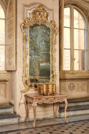 in legno intagliato e dorato a doppia fascia, fascia interna modanata di forma sagomata e impreziosita lungo il bordo da rametti e fogliette di acanto, che nella parte superiore vanno a formare la cimasa scolpita a motivo rocaille, fascia esterna di analoga forma sagomata attorno alla quale si avvolge un motivo continuo di rametti fioriti realizzato a giorno, che si porta fino alla ricca cimasa scolpita a grande cartouche sormontata da foglia aperta e impreziosita da rami fioriti; centro inferiore a foglia aperta rivolta verso il basso inquadrata da volute su piedini a ricciolo, cm 275x130