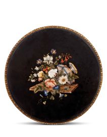 in legno ebanizzato e dorato, piano di forma circolare in marmo nero intarsiato in pietre dure a raffigurare vaso di fiori, inquadrato da cornice a ovoli e sotteso da fascia a unghiature alternate, in corrispondenza delle gambe, a riserve quadrate a centrare un fiore da cui pende un decoro fogliaceo, tre sostegni torniti scanalati e impreziositi da decori fogliacei poggianti su base tripode intagliata a palmette e terminante in piedini fogliacei con finale a ricciolo. Sul retro del piano iscrizione incisa Peter Bazzanti and Son Florence 1871; alt. cm 80, diam. cm 66