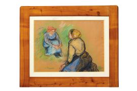 A partire dal 1873, Pisarro si trasferisce nella Val-d’Oise, lavorando tra Pontoise, Osny ed Auvers. Dal 1880, e fino alla sua morte, resta poi a Eragny, nel nordovest parigino, interessandosi ai motivi della vita rurale, ai contadini, i quali, nelle opere successive al 1881, sono ritratti nei loro umili ambienti d’appartenenza, una scelta dovuta, in parte, al credo politico dichiaratamente anarchico del pittore francese. A differenza di Millet, infatti, Pissarro non conferisce alcuna vena sentimentale ai suoi contadini, anzi, in essi troviamo espressa la sua opposizione nei confronti dell’aura romantica che generalmente li circondava. In quanto esseri semplici, secondo Pissarro, questi erano da presentare senza sentimentalismi, nei loro atteggiamenti un po’ goffi e talvolta sgraziati. Mosso da un genuino interesse nei confronti delle loro fatiche quotidiane piuttosto che da un immaginario di tipo letterario, poetico, simbolista, scelse dunque di non renderli attraenti o affascinanti, ma di ritrarli nel loro vero aspetto, nei loro abiti, intenti alle loro occupazioni. A margine della settima mostra impressionista del 1882, dove fu esposta una serie significativa di questi suoi soggetti, Huysmans sottolineò come l’artista si fosse finalmente liberato dal ricordo di Millet, dipingendo «la gente di campagna senza falsa grandezza, semplicemente come egli la vede» (L’art moderne, Appendice, Paris 1883). Il tema delle contadine sedute, nello specifico, trova ampio spazio nella produzione di Pissarro degli anni Ottanta. Nella nostra composizione non troviamo alcuna traccia di enfasi, le due contadine, riprese in atteggiamenti e gestualità di grande naturalezza, sono infatti in un momento di pausa, in posizione di riposo e di spensierato dialogo. La prima, di spalle, è inginocchiata; l’altra, più lontana in secondo piano, ad aumentare il senso di profondità della scena, è seduta con le mani incrociate dinanzi le ginocchia. Straordinaria è la plasticità e la solida volumetria con cui Pissarro rende le loro fisionomie, soffermandosi con sicurezza, ad esempio, sul volto di profilo del personaggio di spalle. L’uso del pastello, derivato dalla grande ammirazione da lui nutrita negli anni Ottanta per Degas, supporta l’artista in una definizione più netta, rapida e dinamica dei loro indumenti, indagati nelle loro trame, nella loro materialità, riuscendo a conferire, al tempo stesso, particolare vivacità e brillantezza alle cromie dei tessuti.