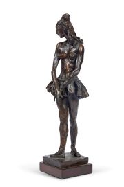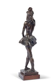 Dance, for Francesco Messina, was one of the highest expressions of feminine beauty, capable of divinising the female figure by exalting the harmony and the simple grace of its forms. Following in Edgar Degas’ steps, beginning in the Seventies Messina’s interests converged in a multiplicity of works devoted to the theme of the dancer portrayed in various poses, both dynamic and static. The key player is always the model’s body, a plastic projection into the surrounding space, “fixed” in bronze as in a series of frames from a film of a single ballet. The long-limbed build, the gaunt anatomy and the excellent muscle tone, as well as the form of the subject’s bust, recall the physique of Luciana Savignano, a celebrated ballerina and Messina’s occasional model, portrayed here in a pose that is collected but at the same time highly-strung. The downcast eyes and the crossing of the legs and arms in the classic position of apparent rest contrast with the entirely interior tension and the suffused muscular vibration evinced by the dancer as she maintains the pose. The flounces of the skirt and the disorderly hair, piled carelessly atop the head, step in to break up the line and increase the sense of depth and chiaroscuro impressed by Messina on this lovely composition.