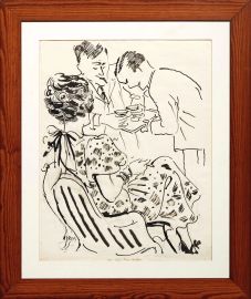 Considerato come uno dei più acuti e graffianti cronachisti della crisi morale della società borghese del primo dopoguerra, con l’avvento del nazismo, Grosz lasciò la Germania e si trasferì definitivamente negli Stati Uniti nel 1933. Nei disegni di questo periodo documenta con avido interesse la vita americana nelle sue tante sfaccettature. Il disprezzo nei confronti della middle class europea, caratteristico della sua precedente produzione, lascia così spazio a una satira in qualche modo compiacente verso l’american way of life. Il nostro disegno fu pubblicato sulle pagine della storica rivista americana Esquire nel febbraio del 1938, come illustrazione per l’articolo The Yale Boy’s Mother di Edward Stevenson. Con sicurezza di linea assoluta, Grosz studia e dettaglia le figure della donna elegantemente vestita e del seduttore che sta per servirle da bere, finendo per spingere le fisionomie dei personaggi al limite del caricaturale, del grottesco, come si evince dai tratti sommari e anonimi del cameriere, rappresentato come una sorta di automa in atteggiamento reverenziale.