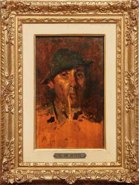 De Nittis spent long periods in Naples and its surroundings in the early 1870s. He had left the area after having studied at Gabriele Smargiassi’s landscape school – that he entered when he was fifteen – and plein air painting near Resina (hence the name of the school De Nittis founded with his friends and colleagues, Federico Rossano, Marco De Gregorio, and Adriano Cecioni). In 1867, after spending time in Florence, he moved to Paris where, to meet the demands of the French market, he painted figures in eighteenth-century costume. And yet, he maintained a lively interest in the simpler world of Naples, and the people he met along the narrow streets or during his excursions to the slopes of Mount Vesuvius. It was a world that he often captured in small paintings, like this one, a portrait of a man wearing a hat and smoking a pipe. The dark eyes focused on the viewer, the serious expression, and long, narrow nose are rendered almost in monochrome blending with the unpainted lower part of the panel. The sitter, facing front recalls one of the two travelers in his famous painting, Strada da Napoli a Brindisi (Indianapolis, Museum of Art) that had been shown at the Paris Salon in 1872.