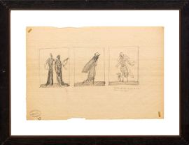 Riferimento imprescindibile nella storia del manifesto pubblicitario italiano, la produzione grafica di Marcello Dudovich ha indagato la vita mondana nei suoi molteplici aspetti, descrivendone la sfaccettata bellezza con sensibilità e raffinatezza. Negli anni d’oro del Liberty, la produzione dell’artista triestino contribuì al processo di emancipazione del cartellone pubblicitario da una condizione di inferiorità rispetto alle arti maggiori a genere totalmente indipendente. La firma di Dudovich si legò a ditte prestigiose, su tutte, nel 1906, a quella della ditta napoletana Mele e, nel 1921, della Rinascente, con la quale mantenne uno stabile e duraturo rapporto professionale fino al 1956. In questi tre disegni, di tratto semplice ed elegante, si riconosce, nella figura di destra, il bozzetto per la campagna pubblicitaria primavera-estate 1922 dell’importante ditta milanese, mentre la composizione centrale sembra reinterpretare la figura femminile del manifesto per le novità estive del 1908 dei Magazzini Mele.