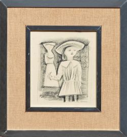 Over the course of his career, Massimo Campigli manifested great interest in graphics and, beginning in the 1940s, illustrated poems and novels by past and contemporary authors. Our charcoal drawing is from this milieu: it is a preparatory drawing for the lithograph entitled La piccola cieca – L’aveuglette from 1952, published that same year in Jean Paulhan’s literary work of the same title and later included in the 1995 catalogue raisonné of Campigli’s works curated by Francesco Meloni (p. 119, no. 143). The female figure, stylised and enclosed within geometrically rigorous forms, is a constant, central element in the artist’s work. Campigli made forty prints of this etching, numbered with Roman numerals and with no indication of total number of copies, and another four, on Arches paper, destined for use as the frontispiece to the above-mentioned volume by Paulhan.