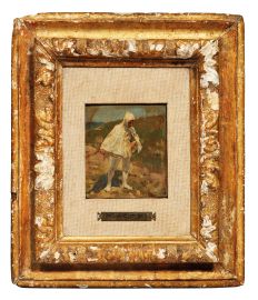 The contemporaries of Giotto’s master Cimabue recalled him dressed in white and Andrea di Bonaiuto, in the Cappellone degli Spagnoli or Chapter Room of Santa Maria Novella in Florence portrayed him thus, wearing a short white cloak, the hood over his head, a shirt, hose and shoes, all just as white. Raffaello Sorbi copied this iconography in his Giotto e Cimabue (1919), for which this small panel is a study. The Florentine painter Sorbi worked from the latter half of the 1800s through the 1920s; his work is always strongly characterised by references to 18th-century, medieval, and even Pompeian art. Remembered as one of the top students at the Scuola Libera del Nudo – in truth, a school of life drawing of all sorts – inaugurated in Florence in 1859 by Ticinese painter Antonio Ciseri as a complement to the academic courses, young Sorbi distinguished himself early on and won an award at the Florentine Triennale contest of 1861 with a work which, to paraphrase Telemaco Signorini, made the Florentine old guard believe that the miracles of 15th-century art had returned (T. Signorini, “Come l’assenza della critica isterilisca gl’ingegni. Dei quadri del signor Raffaello Sorbi” in Gazzettino delle Arti del Disegno, yr. I, no. 8, 9 March 1867). Sorbi, in fact, demonstrated that he possessed great ingenuity and a considerable pictorial ability which immediately aroused the interest of numerous admirers. In the small panel, a full-length Cimabue approaches the stone on which the young Giotto drew the famed O. With his left hand resting at his waist and the right holding the cord to which, in the canvas, the horse is tethered, he bends his head toward the ground. The same gesture is repeated in the canvas, in which, however, the young Giotto is portrayed at Cimabue’s feet, his hands resting on the stone outcrop, surrounded by his sheep.