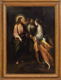 Anna Coliva (1980, p. 106) proponeva di associare il dipinto qui offerto a quello di uguale soggetto ricordato dalle fonti bolognesi (Masini e Malvasia) nella sala capitolare della chiesa di S. Procolo a Bologna. Lo stesso soggetto è presente però anche nella raccolta di Vincenzo Giustiniani, inventariata nel 1638, in una tela di grandi dimensioni (dodici palmi per otto) che la nostra composizione forse replica in piccolo, e ancora, ma senza indicazioni di dimensioni, nella raccolta bolognese di Giacomo Maria Marchesini nel 1685. Frequenti le citazioni di opere del Mastelletta nelle collezioni bolognesi come in quelle romane, tra cui quella del cardinal Flavio Chigi e del raffinatissimo Bonaventura Argenti.