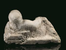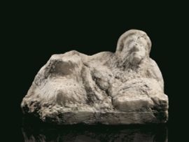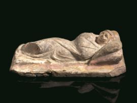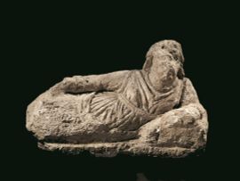 Coperchio di urna cineraria volterrana in alabastro, raffigurante il defunto come banchettante, sdraiato a sinistra su una kline, appoggiato sul gomito sinistro ad un cuscino, a torso nudo con corona floreale fra i capelli, nell’atto di sorreggere una patera nella mano destra. 50x23x30 cm.