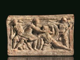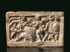 Urnetta quadrangolare decorata sulla fronte con scena dell’eroe che combatte con l’aratro (Echetlo), in atto di abbattere un guerriero inginocchiato che si ripara con uno scudo rotondo. Ai lati due armati che si dirigono verso la figura centrale. Dim. 39,5x20,4x22 cm