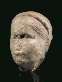 Testa-ritratto di donna con complessa acconciatura di trecce avvolte a cercine intorno alla testa. Nonostante la marcata alterazione delle superficie si vedono i capelli che coprono parte delle orecchie e gli occhi a mandorla. H. 23,8 cm.