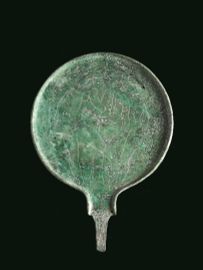 Specchio a disco con manico a verga sagomato. La decorazione, ad incisione, sulla parte non riflettente, è costituita dalla coppia dei Dioscuri Castore e Polluce, figli di Zeus e Leda. I giovani sono nudi e con clamide sulle spalle. Lungh. cm. 25,4; diam. cm. 18.