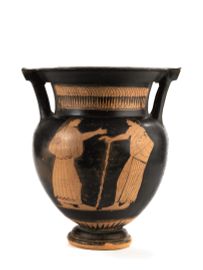 Cratere a colonnette con orlo appiattito, collo troncoconico, corpo ovoidale, piede a doppio echino. Le anse verticali sono poste sulla spalla e si inseriscono sull’orlo mediante una placchetta. Lato A: personaggio maschile, stante e ammantato, che attinge del vino con un’oinochoe da un pithos infisso nel terreno. Lato B: scena di corteggiamento con una figura maschile appoggiata a un bastone che parla con una figura femminile. Integro con qualche scheggiatura. H. 31,5; diam. orlo 24,5 cm