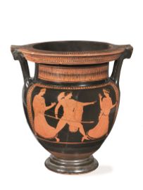 Questo grande cratere può essere ascritto alla produzione dei primi manieristi, ceramografi attivi nel secondo quarto del V secolo a.C. nel Kerameikos di Atene, che si ispiravano in età classica alla produzione precedente (su cui, concentrato più sulla fase avanzata del fenomeno T. Mannack, The Late Mannerists in Athenian Vase-Painting, Oxford 2001). La scena che compare sul lato A del vaso, rientra nelle pursuit scenes che sono ben attestate nell’iconografia vascolare del periodo. Analogie per la resa delle figure e per la composizione della scena con un vaso in collezione privata (Sotheby’s 22.5.89, 80, n.287 – BAD 44367) e con un cratere del Pittore di Efesto (Paris, Cabinet des Medailles: inv. G362 - Beazley, ARV 2 , p. 1115, n. 17).