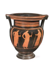 movimento, con la testa e il torso rivolti verso la figura centrale. Il lato B è decorato con tre figure maschili stanti. Gli uomini sono ammantati e con bastoni in mano. La decorazione secondaria consiste in palmette e corona di boccioli sull’orlo e sul collo e corona di raggi sul piede. Diam. orlo 32,6 cm; h.39,2 cm.