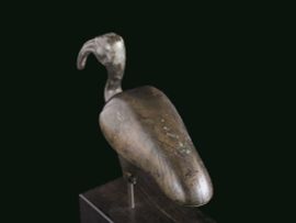 Bronzetto raffigurante un ibis, ipostasi di Thot, dio della sapienza, della magia e della luna. L’uccello è raffigurato con le ali chiuse sul dorso e con il lungo collo eretto. Sottili ed accurate incisioni rendono i principali dettagli anatomici, disegnando le penne sul dorso. Gli occhi dell’ibis sono resi con l’applicazione di una sottile lamina in oro, dettaglio caratteristico dei prodotti di più elevata qualità. Lungh. 12 cm