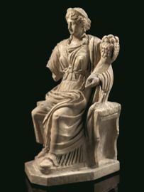 Statua femminile seduta raffigurante una Tyche / Fortuna, divinità dell’abbondanza, che tiene la cornucopia con la sinistra. Nonostante la testa, parte dei seni, la mano sinistra e la base della statua siano di restauro (realizzati con ogni probabilità nella prima metà del XIX secolo) e qualche rilavorazione delle superfici, l’identificazione del tipo iconografico è certa. La divinità siede su di uno sgabello senza spalliera e indossa una lunga veste cinta sotto i seni. Un ampio mantello, poggiato sulla sinistra, ricade con pieghe pesanti in grembo. H. 76 cm.