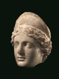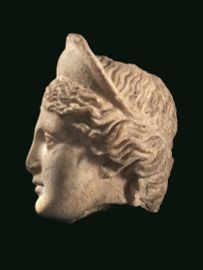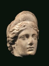 Testa in marmo bianco a grandi cristalli (marmo greco insulare?), fratta alla base del collo e lievemente volta verso sinistra. Raffigura una giovane donna, dal volto ovale pieno, con grandi occhi, naso diritto, piccole labbra schiuse e con labbro inferiore più sottile rientrante. La chioma presenta una scriminatura centrale da cui si dipartono le singole ciocche, tirate indietro e raccolte sulla nuca. Due corte ciocche arcuate scendono davanti alle orecchie. Sul capo è posto un diadema semilunato modanato nel suo tratto superiore e fissato sulla testa da un nastro. I passaggi di piano sono resi da un modellato tenue a rendere l’incarnato del volto. I fori di trapano a rendere i lati della bocca, le orecchie e le caruncole lacrimali. H. 21,5 cm.