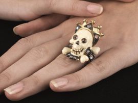 a forma di teschio recante una corona, decorato con smalto bianco e diamanti sfaccettati per ct 1 circa, firmato "A.Codognato", punzone 750, mis. 16, g 27. Corredato di scatola.