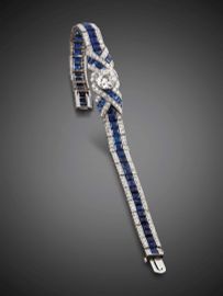 al centro un elemento a nodo con diamante taglio vecchio di ct 2.50 circa, trattenuto da un elemento a binario a due file di diamanti taglio huit huit per ct 3 circa e al centro una fila di zaffiri calibrati, punzoni francesi del platino e del fabbricante Claude Bernard, lungh. cm 18, g 19