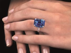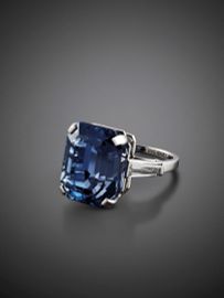sulla sommità uno zaffiro taglio ottagonale di ct 25.89, affiancato da due diamanti taglio tapes per ct 0.80 circa, firmato "Bulgari", mis. 9, g 11. Corredato di certificato I.G.N. del 20/07/2019 attestante l'assenza di trattamenti termici e l'origine birmana