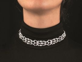 con figure a forme di stella e di mezzaluna impreziosite da diamanti taglio brillante per ct 5 circa, punzoni 750 e del fabbricante, lungh. cm 44, g 55