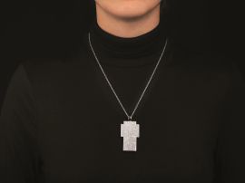 con pendente a forma di croce, impreziosita da pavè di diamanti taglio brillante per ct 4 circa, firmata "Korifidis", punzoni 750 e del fabbricante, dim. cm 2,7x4,5, lungh. cm 49, g 33