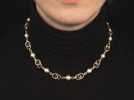 ad un filo di elementi circolari intrecciati alternati a perle di mm 7 circa, punzoni 750 e del fabbricante, lungh. cm 42, g 43