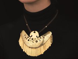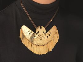 impreziosita da un grande pendente in oro giallo a forma di aquila stilizzata di cm 12x9 circa, con motivi geometrici incisi e medagliette pendenti, punzone 750, laccio in cuoio con chiusura in oro, lungh. cm 39, g complessivi 82