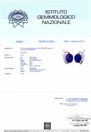 impreziositi da zaffiri taglio cabochon per ct 16, circondati ai lati da volute con diamanti taglio brillante e huit huit per ct 0.30, punzone 14Kt, dim. cm 1,50x2,50, g 13. Corredato di certificato I.G.N del 11/09/2019 attestante le caratteristiche, l'origine degli zaffiri e l'assenza di trattamenti.