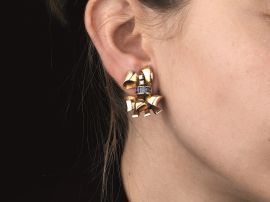 a forma di fiocco, con zaffiri taglio carrè per ct 1.20 circa e diamanti taglio brillante per ct 0.20 circa, chiusura a clip, lungh. cm 3, g 19