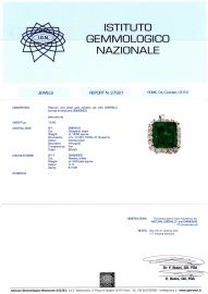 impreziosito da uno smeraldo brasiliano taglio ottagonale di ct 18.50, affiancato da una corolla di diamanti taglio navette per ct 3, colore H-K, purezza IF-Vvs, dim. cm 2x2, g 15. Corredato di catenina in argento e da certificato gemmologico I.G.N del 04/10/2019 attestante le caratteristiche e l'origine geografica dello smeraldo.