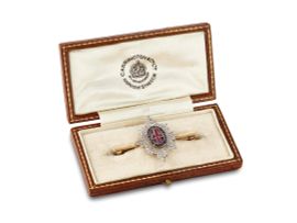 A REGIMENTAL BARRETT BROOCH IN WHITE AND YELLOW GOLD WITH ENAMEL RUBIES AND DIAMONDS