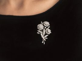 motivo floreale, con piccoli fiori tremblant, impreziosita da diamanti taglio brillante per ct 5.70 circa, punzone 750, dim. cm 5,50x3, g 17