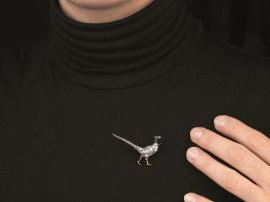 a forma di fagiano, impreziosito sul capo da smalti policromi e sul corpo da diamanti taglio antico e rose di diamante per ct 0.40 circa, dim. cm 4x2, g 4