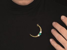 a forma di mezzaluna, impreziosita da uno smeraldo taglio antico di ct 0.50 circa, affiancato da due diamanti taglio antico per ct 0.80 circa, lungh. cm 4, g 6