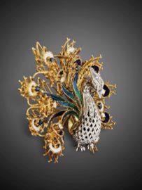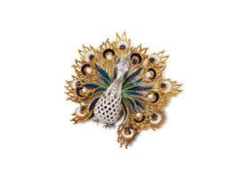 a forma di pavone, decorato con smalti policromi, impreziosito da diamanti taglio brillante per ct 0.30 circa e piccoli zaffiri, punzoni 750 e del fabbricante, dim. cm 5,5x5,5, g 47