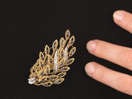 SPILLA IN ORO GIALLO E BIANCO CON ZAFFIRI E DIAMANTI