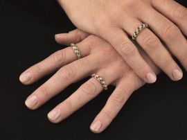 uno impreziosito da diamanti taglio brillante per ct 0.20 circa e rubini taglio misto per ct 0.20 circa, punzone 750, mis. 14, uno impreziosito da diamanti taglio brillante per ct 0.20 circa e zaffiri taglio vecchio per ct 0.20 circa, punzone 750, mis. 12, uno impreziosito da diamanti taglio brillante per ct 0.20 circa e smeraldi per ct 0.10 circa, mis. 14, g complessivi 8