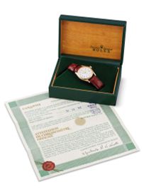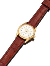 cassa oyster in oro giallo, ghiera zigrinata in oro, quadrante bianco con numeri romani applicati, vetro plastica, movimento a carica automatica cal. 1570, cinturino in pelle con fibbia placcata oro. Corredato di scatola e garanzia. Diam. mm 34