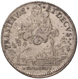 Ag gr. 28,91. D/ POPVLVS ET SENATVS BONON Stemma della città sormontato da testa leonina e accostato da rami d’alloro R/ PRAESIDIVM ET DECVS La Beata Vergine col Bambino su nubi, sotto, veduta della città con alberello e Santuario. Gig. 4