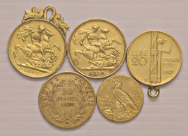 FIVE GOLD COINS OF DIFFERENT COUNTRIES Au tot. gr. 33 VF/EF some mounted