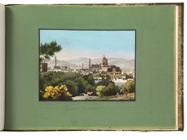 Album in-folio oblungo (270 x 384 mm) contenente 56 vedute incise all’acquaforte colorate a gouache e all’acquerello da mano coeva, con rilievi “a la gomme”, tutte inquadrate da una cornice nera a filo con l’inciso, e con i margini tinteggiati di verde. Allegate in fine 4 tavole calcografiche e 2 litografiche (pallidamente fiorite ai margini). Le vedute riportano talvolta i titoli scritti in calce a matita da mano coeva. Legatura coeva in mezzo marocchino scuro con angoli, dorso a nervi con titolo “Florence” e filetti dorati, piatti e sguardie marmorizzati. Minime abrasioni alla tavola con l’interno del duomo di Livorno, tracce d’uso ai margini, e altre trascurabili tracce del tempo, ma nel complesso copia molto buona.