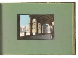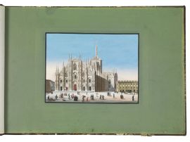 SPLENDIDA RACCOLTA DI VEDUTE COLORATE A MANO, che si apre con piazza San Pietro a Roma, piazza Duomo a Milano, e piazza San Marco a Venezia. Prosegue poi con 3 vedute di Livorno, 3 di Siena, 6 di Pisa, e, a seguire, 41 di Firenze. In fine, tre incisioni calcografiche che ritraggono le porte del Battistero di Pisa, incise da Paolo Lasinio su disegni di Vincenzo Gozzini, e una quarta che ritrae l’antico gruppo scultoreo noto come Toro Farnese; le due litografie ritraggono Leopoldo II di Toscana (1797-1870) e la sua seconda consorte Maria Antonietta. Tutte le vedute sono finemente colorate a tinte accese e arricchite da rilievi “a la gomme”; le scene rappresentano esterni e interni spesso animati da figurine abbigliate alla moda dell’epoca.