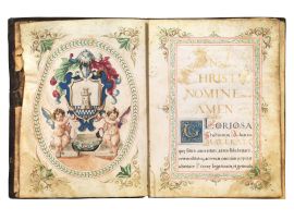 Manoscritto su pergamena in 4to (266 x 200 mm), [8] carte. Completo. Antiporta miniata a colori con lo stemma della famiglia Marocco sorretto da due putti entro cornice ovale e fregi floreali accantonati; incipit con iniziale miniata in oro su fondo azzurro e altre lettere maiuscole più piccole in oro, azzurro e rosso; testo in nero con iniziali e parole in oro, azzurro e rosso, il tutto entro cornici decorative diverse tra loro, con fregi floreali accantonati. Legatura coeva in marocchino rosso scuro con ricco decoro in oro che comprende le armi Marocco al centro, affiancate dalle iniziali “LM”, entro riquadro con cornucopie, cesti fioriti, ghirlande, fronde, ecc., entro ricca cornice. Ex libris di Cortlandt Bishop al contropiatto, con altre note di mano ottocentesca. Testo sciolto dalla legatura, galleria di tarlo alle ultime carte (soprattutto l’ultima, ma non lede più di tanto lo scritto), tracce d’uso e del tempo, legatura un po’ usurata, ma nel complesso bellissimo oggetto genuino.