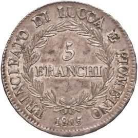 Questo esemplare, mai contemplato in alcuna pubblicazione sulle monete del Principato di Lucca e Piombino o di quelle che si sono occupate delle emissioni del periodo napoleonico, si caratterizza per la presenza della sigla “X” sotto i busti dei Principi al dritto. Tale contrassegno potrebbe identificare, con tutta probabilità, una prima prova di coniazione per la sua presentazione agli ufficiali di zecca. Da qui l’elevata conservazione dell’esemplare, senza alcuna traccia di usura da circolazione e di peso massimo consentito per questa specie, e la sua unicità.