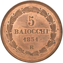 Cu gr. 42 D/ PIVS IX PONT MAXIMVS ANN V Stemma sormontato da chiavi e tiara R/ 5 BAIOCCHI 1851 R (zecca di Roma) entro corona di lauro Gig. 172 Mont. 250