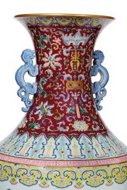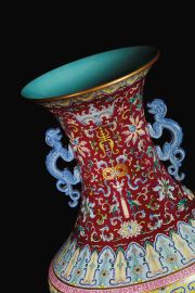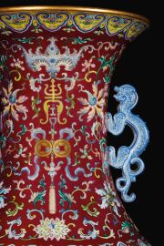 Il vaso di forma a balaustro ha un collo elegantemente affusolato a cui sono applicate due anse con draghi arcaistici stilizzati. Il collo, a fondo rosso rubino, è decorato su ciascun lato con dei grandi pipistrelli e delle monete sopra una fioritura di loto e crisantemi stilizzata, dipinta con smalti leggeri. Sulla spalla troviamo due fasce a tutto tondo: la prima con fiori e rami di colore rosa, e la seconda, posta al di sopra, composta da petali e fiori stilizzati. Il corpo ovoidale è finemente smaltato a scena paesaggistica continua raffigurante corteo di figure femminili che suonano, incorniciata da teste di Ruyi, il bordo è rigorosamente dipinto in oro e l'anello di base ricoperto da un color rosso ferro con greche anch' esse dorate, l’interno e la base del vaso sono smaltati in monocromia nei toni del turchese; alt. cm 75 e diam. cm 40 (circa)