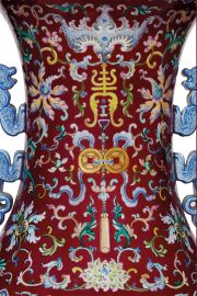 Sul vaso sono presenti vari simboli di buon auspicio: pipistrelli, fiori di loto e monete, nonché volute vegetali finemente rappresentate.