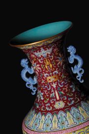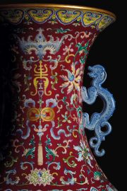 Ai lati del collo troviamo le due anse: due draghi kui di colore blu. La forma arcaistica di questi, così come quella del vaso stesso, era di uso comune per la produzione delle porcellane imperiali durante il regno Qianlong. Altro particolare molto frequente di questo periodo, era l’impiego di smalti della famiglia rosa, qui utilizzati nella vivace decorazione che circonda il corpo principale del vaso, composta da figure nel paesaggio