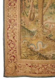 Oltre al pezzo della Leonessa nel fiume, altri elementi superstiti della serie, di uguale stile figurativo, pari altezza e rifiniti con la stessa bordura, sono: il Rinoceronte (475 x 505 cm, con firma di Raes e marca Van den Eynde), in Italia fino al 1978, poi in una collezione privata belga (9); il Leopardo sullo stagno (467 x 587 cm; con marca Van den Eynde) di proprietà del Sovrano Ordine di Malta in Palazzo Savelli Orsini a Roma (10); gli Struzzi (470 x 592 cm, con marca e firma di Raes) nella medesima raccolta (11); il Cervo (473 x 340 cm) della Galleria Rabel a San Marino (fig. 2) (12); il Drago mangia le uova (455 x 315 cm) nel Palazzo dei Granduchi di Lituania a Vilnius (13); il Leopardo che attacca il leone, diviso in due frammenti passati sul mercato, di ignota collocazione (14). Sono poi note altre redazioni, meno sontuose e con bordure diverse, dei Paesaggi con animali di Raes, compresa una replica della Leonessa nel fiume (344 x 451 cm), in asta presso Sotheby’s, Zurigo, il 10 dicembre 1996, lotto 230, poi di Nathan Levi a Firenze (15).