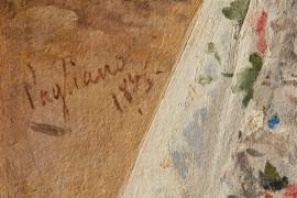 Il timbro garbatamente malizioso di queste due composizioni in costume esplicita una generosa sensualità, come rivelato dai décolleté delle due fanciulle, che danno risalto alla loro provocante e fresca bellezza. Sicuramente la loro gioiosa avvenenza doveva costituire una delle maggiori attrattive di questa coppia di dipinti, al punto da essere più volte riproposti con varianti d’artista per soddisfare le richieste sempre più frequenti della facoltosa clientela borgese italiana e internazionale, come possiamo evincere anche da un’altra opera Giocando a cerchietti, ora in collezione privata, documentata in passato dal mercante d’arte fiorentino Luigi Pisani. I due dipinti che presentiamo in questa vendita ben s’inseriscono in quel periodo compositivo di gusto neosettecentesco che Pagliano predilige sin dai primi anni Settanta dell’800, in parallelo agli esiti di altri due eminenti pittori attivi a Milano quali Gerolamo Induno e Mosè Bianchi. In quegli stessi anni Pagliano aveva già riscosso molto successo con l’opera L’estate di San Martino (già Galleria d’arte Moderna), datata 1875 e con il dipinto La lezione di geografia (Milano, Fondazione Cariplo), eseguito nel 1880.